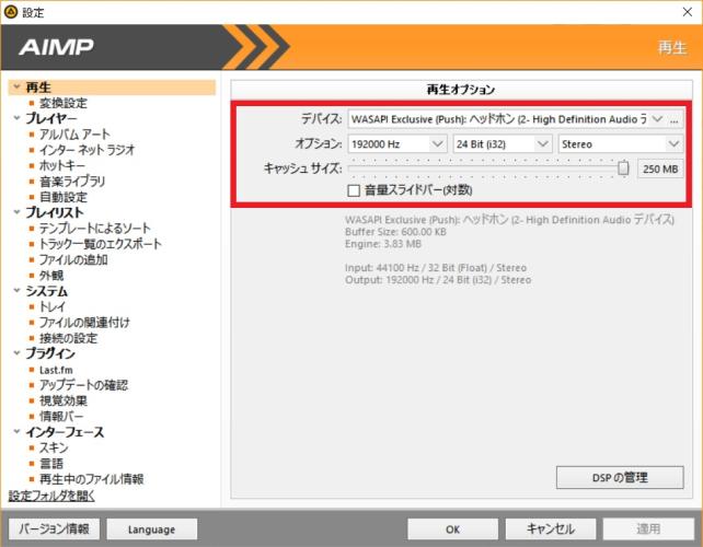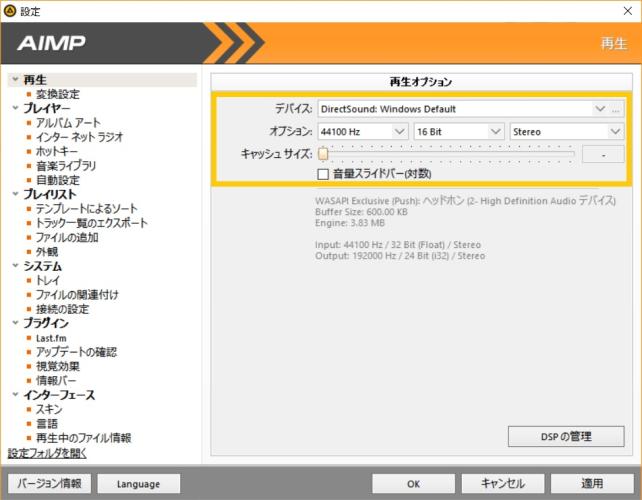 「AIMP」での音楽再生は“ASIO”や“WASAPI”に対応しています。