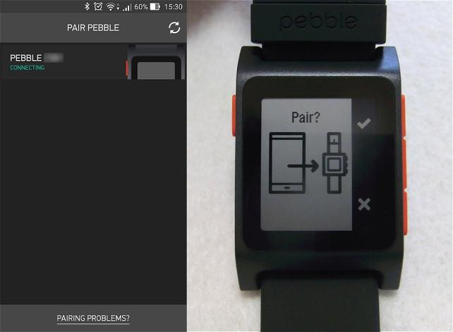 スマートフォンとPebble 2 +HRをBluetoothでペアリングする。 スマートフォンでBluetoothをONにすると自動的にPebble 2 +HRが検出されるので、タップする。Pebble 2 +HR側では接続確認がされるので、右上のボタンを押してOKする。タッチスクリーンには対応していないので、左右のボタンを押して操作する。ペアリング完了後にはファームウェアが自動的に更新される。