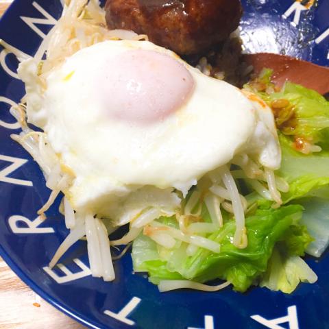 ごはんが炊けていたら実質10分以内で完成します・・・即席ロコモコ風丼。夜中に急に食べたくなった時に最適! 野菜は蒸したてが最高ですので作り置きは厳禁です(^^;