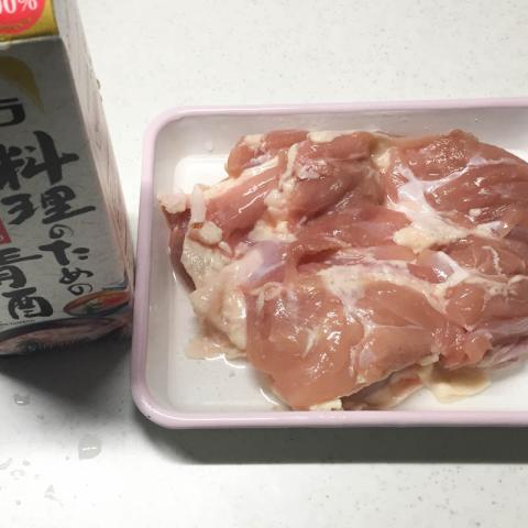 いつもは鶏の胸肉を使うのですが、今回は家にあったもも肉を使ってみます。我が家はお酒を飲まないので料理酒は料理用のお酒を・・・