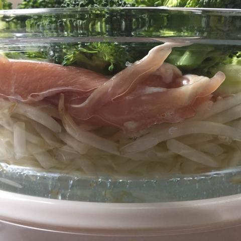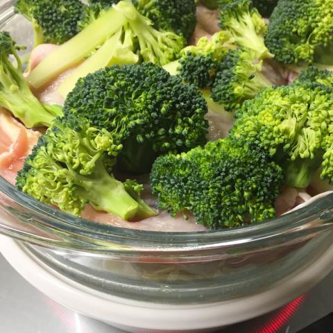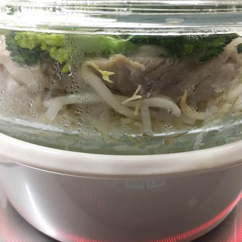 いい感じで、鶏のダシ・・・エキス?が蒸したお湯に移っています。塩、酒などの調味料も、もやし、ブロッコリーのエキスも混ざっています。リュミナルクのスチーマーで蒸すとアクも少ないということですが、その通りほとんど出ていませんでした。