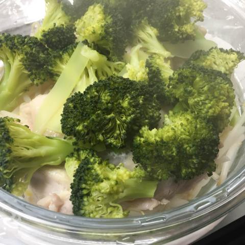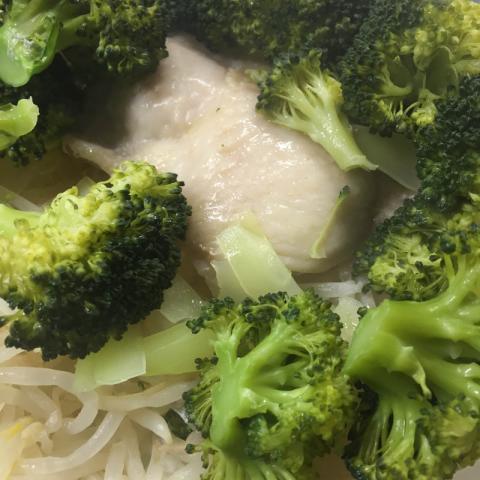 もやし、ブロッコリー、鶏肉を盛り付けます。オリーブオイルをかけて完成です。