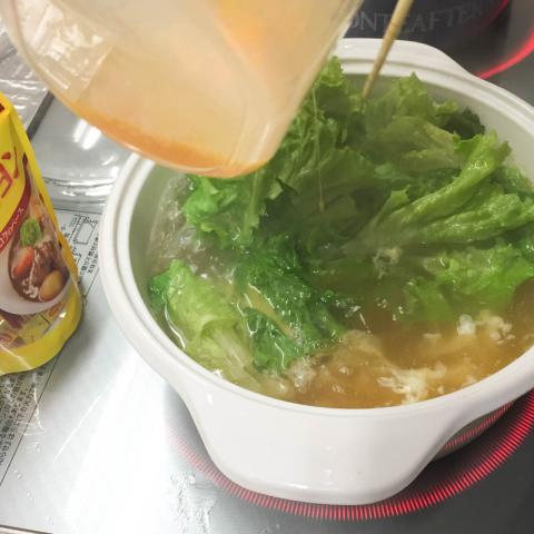 沸騰したら、レトルトのチーズ入りハンバーグを投入(ハンバーグから作っていたら間に合わないのでw)