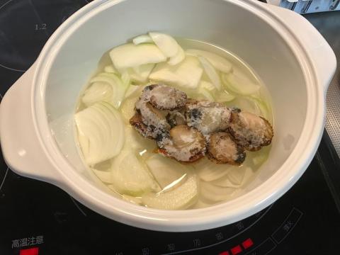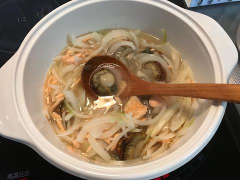 ヴィトロ ブルーミング スチーマー付両手鍋に水と玉ねぎ、凍ったままのヒオウギ貝を入れます。