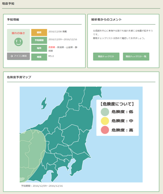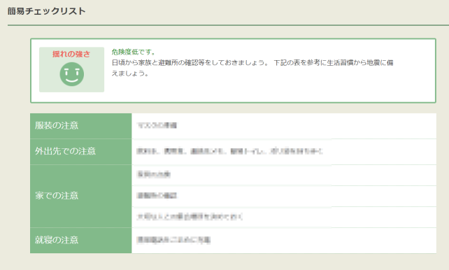 「危険度が高の期間中はこういう場所には近づかない方が良いよ」とか「こういうものを準備しておくといいよ」という感じのものがチェックリスト化されているので、予知に応じて対応すべきことを確認することが出来ます。