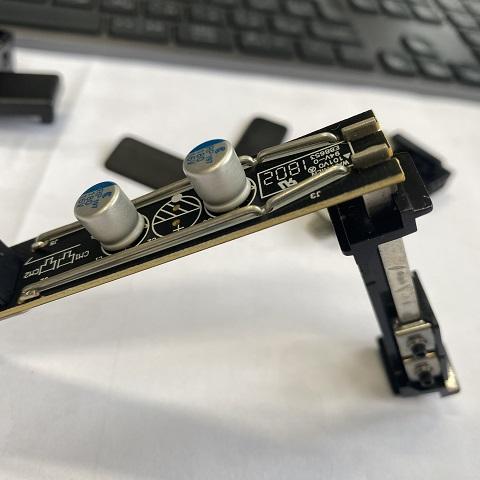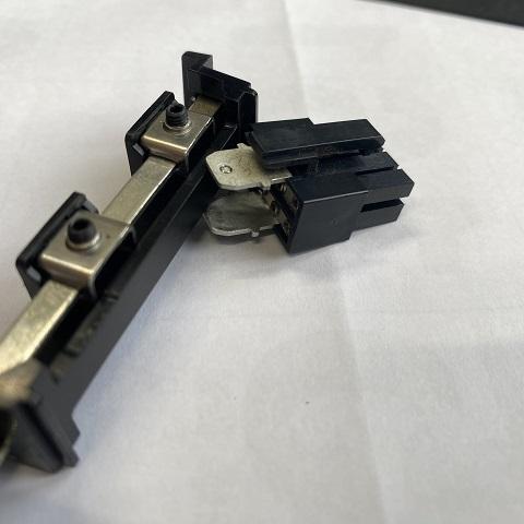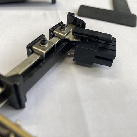 写真はラジオペンチで修復した後だが、ボルトはグイグイ締め込めるので2枚のプレートがUの字のように曲がっていました。2枚のプレートとコネクター側の板を密着させて電源を供給させるみたいだけど、しっかり密着はせず、単に接触しているだけじゃないかと感じる。1枚のプレートなら上下で締め込めばしっかり取りつくが、2枚だと片方向からしか力は入らないので曲がるのは当然ですよね。どんなに締めてもプレートは逃げていくだけなので締めるというより押す?イメージなのでUの字に曲がってしまうのでしょうね。