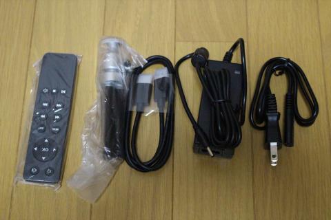 付属品は、リモコン、ミニ三脚、HDMIケーブル、DC電源です。