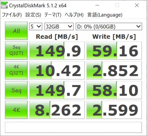 結果としては、リード150MB/s前後 ライト 56MB/s前後をマークしました。