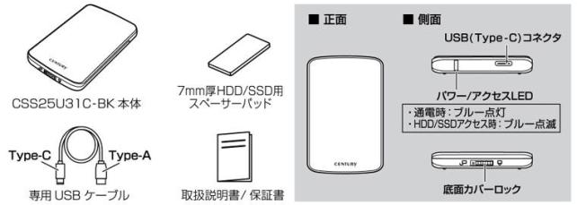 付属品は、本体以外に、USB 3.1 Type-C - USB 3.1 Type-Aケーブル , 7mm厚HDD/SSD用スペーサー , 取扱説明書だけです。