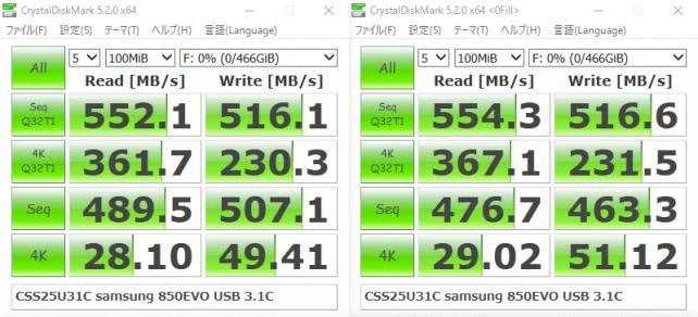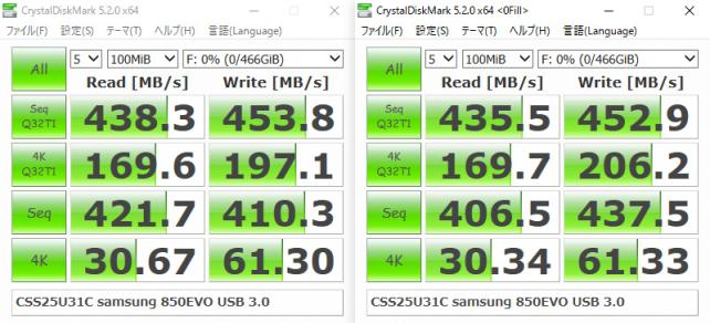 今回は、現在私が所有している SATA3 SSDのなかで、最も高速であろう SAMSUNG 850EVO 500GBを入れてCrystal DiskMarkを走らせてみました。