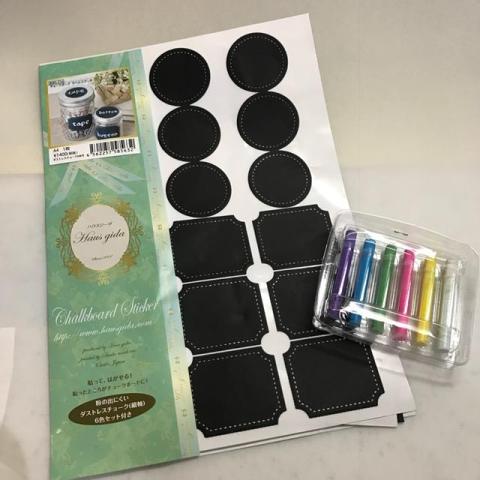 丸ステッカー6枚(直径47㎜)、四角ステッカー6枚(44×53㎜)、6色のダストレスチョークのセットです。