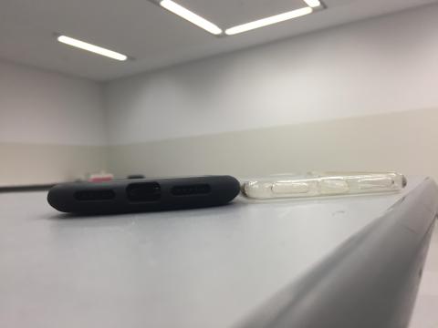 色が透明なので中が見えるのは利点なのですが、樹脂が均一にiPhone筐体に張り付くわけではないので、見た目があまりよくありません。ブラック筐体を入れても、ジェットブラックっぽく見える利点はありますが、ジェットブラックを使っていると、その利点もありません。