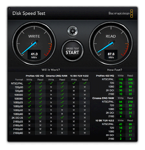 早速Blackmagic Disk Speed Testでベンチマークをとってみました。
