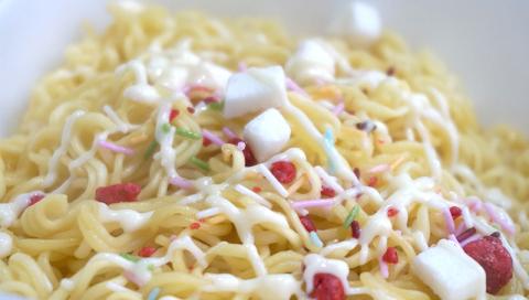 ただこれ、かやくをいっしょに口にすると途端に破壊力が増す。果物系の酸味と甘味、そして香りが加わるので違和感がとんでもないことになる。よくわからない味だ。ショートケーキってこういう味だったっけ?中途半端な甘じょっぱさのせいでむしろチョコソース味を食べたくなってきた。