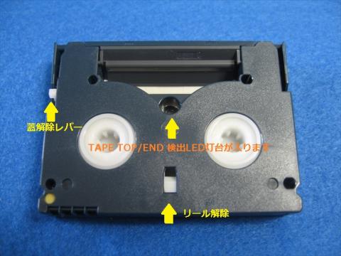 8ミリビデオにメカ構成は似ています カセット底面の中央にLEDの灯台があり、蓋が開くとカセット本体のTOP/ENDの穴と灯台のLEDが一直線になり、テープの透明部を検出すると停止します。