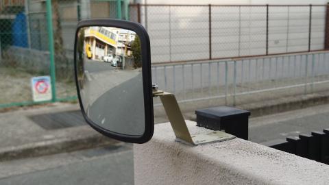 いわゆるカーブミラーを付けていますが、クランプ式は小さいものしかないので近所で出合い頭事故があったことをきっかけに大きめのカーブミラーを取り付けようと思い、境界のブロック塀に設置。