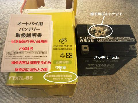 以前、台湾ユアサバッテリーを購入した時は、電解液が別に付属しており、注入後に補充電する必要が有ったが、充電済みの様ですね。