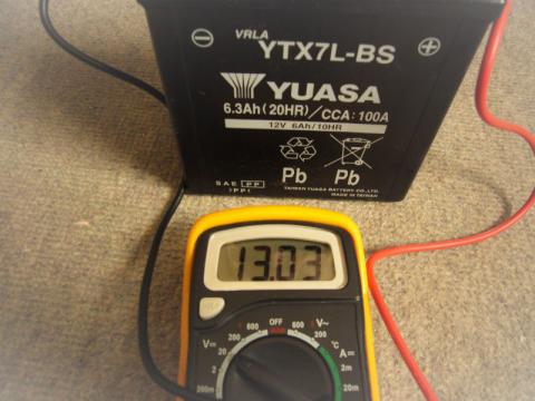 充電済みなのか確認の為に電圧を測ってみると、13.03Vと充電済みだった様です。