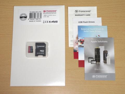 128GBのmicroSDXCカード。スピードクラスはclass10 UHS-I対応、SDカードアダプタ付。