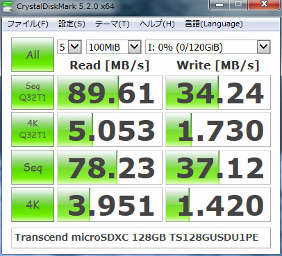 シーケンシャルリードは約90MB/s。シーケンシャルライトは34MB/s。