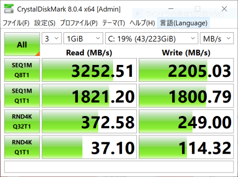 一応オンボードSSDの性能も計測しておきました。
