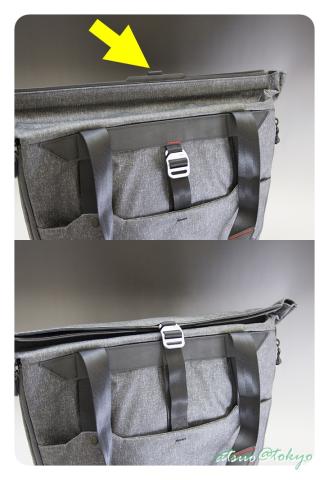 マグネットで口が留まっているとはいえメインの口から水が入り易いですが、前面にあるフックによりしっかり閉める事が出来ます。