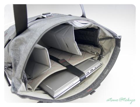 反対側は、13インチ程度までのノートパソコンやタブレットを入れられるようになっており、フェルト素材の仕切りが付いており 2台入れられるようになっています。