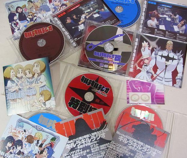 「キルラキルラジオ」に関しては、正規版ともいえる3枚に加えて、コミケ85で売られた録り下ろしの「特別編」と、Blu-rayもしくはDVDの2巻購入者特典として制作されたものがある。さらに後者は実は販売店舗によって、主人公の纏流子を演じた小清水亜美とマコのおやじさん満艦飾薔薇蔵役の堀内賢雄をゲストに迎えた「纏流子side」とライバル鬼龍院皐月役の柚木涼香と四天王のひとり猿投山渦を担当した檜山修之をゲストに迎えた「本能字学園side」があって、いわば番外編というべきものが3枚あったが、それも完全入手。