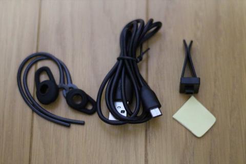 イヤーフック、イヤーパッド、充電ケーブル、エアコン吹き出し口設置用クリップ、粘着テープが付属しています。