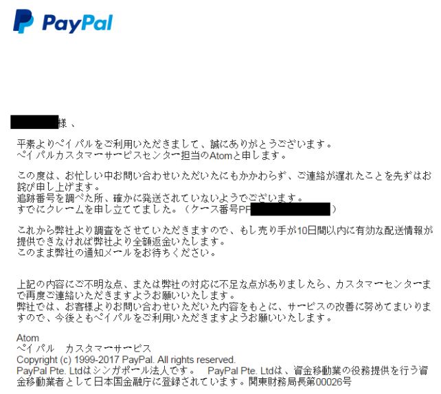 と来たんでペイパルへ送ったらペイパルからこういう返事が来たんです
