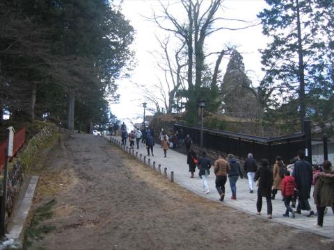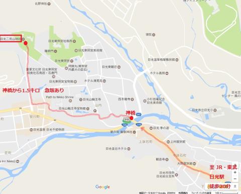 日光駅前の国道119号線を駅から右手に歩いていきます ゆるい坂道を登っていくことになります 2キロくらいで赤い神橋(しんきょう)につきます 神橋を渡っても良いですが119号の横断歩道から左手に5M位行った処から急な坂道ですが登れます 急坂は無理な人は更に左に行くと神橋を渡った処から登れます 20分くらい歩くと二荒山神社に到着です 今回はタクシーで下画像の右の矢印手前で