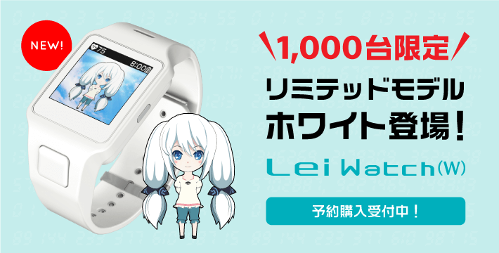 Lei Watchの起動ロゴです。本体右サイドのボタンを長押しすると電源がはいります。起動ロゴの次に待受け画面になります。デフォルトは普段着ですが、こちらは一度メイド服に替えた後の画面になっています。