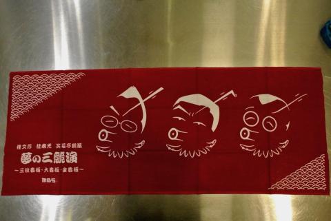 この落語会の手ぬぐいは、お三人師匠方のお顔をディフォルメして「楊枝が刺さったたこ焼き」の雰囲気でデザインされています。