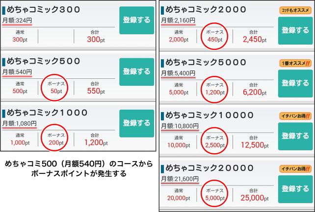 その後、月額コースの選択に移ります。月額コースは324円~21,600円までの7コースになり、金額が高いものほど、ボーナスポイントが取得できます。