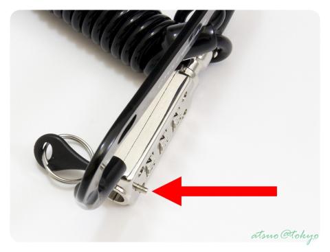 メインはコイル状になったワイヤーとダイヤル錠の付いたカラビナですが、開錠番号セット用のピンが付属しています。