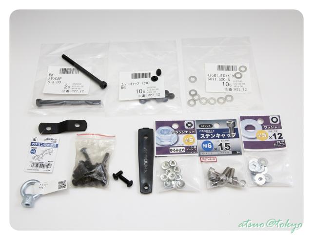 またワッシャーやナットなども黒で統一したかったのですが、ホームセンターでは置いておらずネットで探してあっても送料まで合わせると高いモノばかりでしたので、裏側で見え辛いとこに使うので通常のモノ(銀色)にしました。