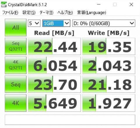 読み出し速度/書き込み速度:最大80MB/s / 最大20MB/sをうたっていて、この速度はベンチマークで本当に出た!