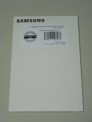日本サムスン正規品メモリーカードで10年保証がつく。microSDXCカードアダプタが付属する。スピードクラス:Class10 UHS-1対応。容量は64GB版で、購入したときは2480円だった。今は値上がりしているw