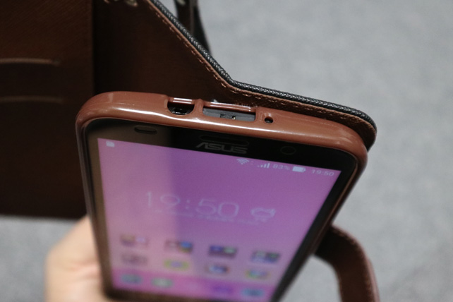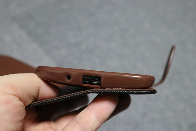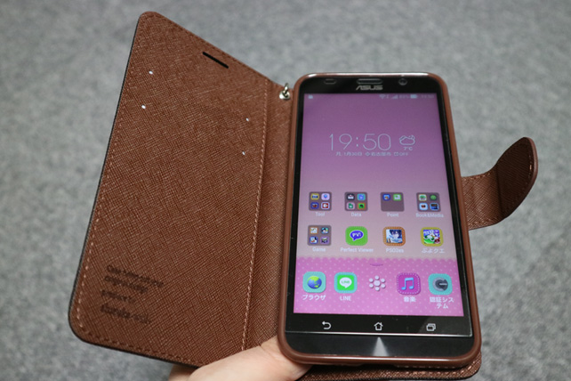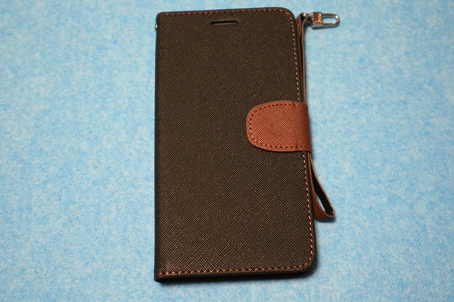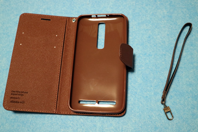手帳のバンドみたいなところに磁石が入っているので、パカパカしないように抑えておけるし、ハトメ穴が開いているので、いざというときは長いストラップに変えることもできますし。