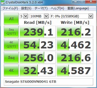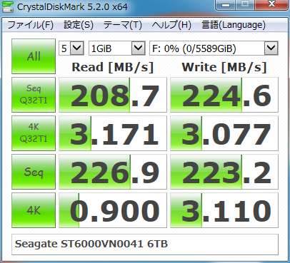 ベンチマークの結果は10TBモデルには及びませんがシーケンシャルアクセスは200MB/sオーバーと非常に高速。HDDとしては十分な性能を有していることがわかります。
