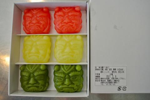 茶鬼はもっと抹茶風味、赤鬼は梅風味を期待しましたが、ほぼ色粉だけの工夫のようで味わいに差はありませんでした。 もっとも黄鬼がレモン味でも困りますよね。