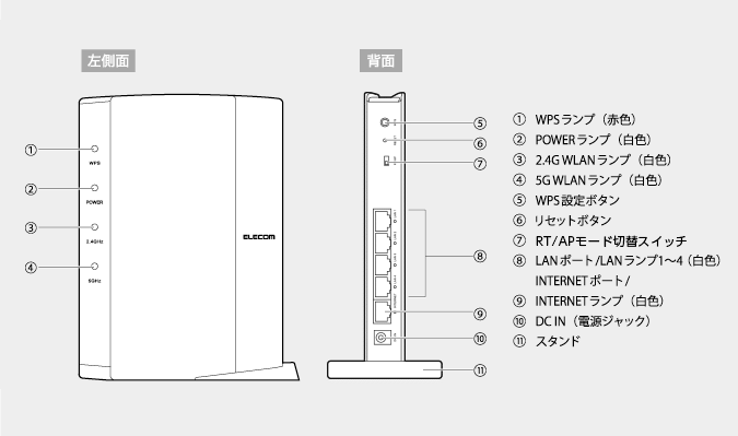 IPアドレス固定接続 LAN接続方式設定 固定IPアドレス(手動設定) ローカルサーバー機能 ポートフォワーディング,DMZ WAN設定 DHCP、固定IP、PPPoE LAN設定 DHCPサーバー、固定IPアドレス その他機能 UPnP対応、IPv6パススルー、PPPoEパススルー対応 □その他仕様 DDNS SkyLinkDDNS(エレコム提供 DDNSサービス)、DynDNS 電源コネクタ DCジャック 入力電源 AC100V±10% 50/60Hz 省電力機能 LED省電力 消費電力 12W 外形寸法(幅×奥行き×高さ) 約26×130×182.5mm(スタンド含まず) 質量 約230g(本体のみ) 各種取得規格 VCCI(クラスB), TELEC 保証期間 1年間 付属品 無線LANルーター 1台、スタンド 1個、ACアダプター 1個、LANケーブル 1本、CD-ROM 1枚、各種マニュアル、設定情報シート 1枚、イカロスライセンスシート 1枚、U-NEXTカタログ 1枚