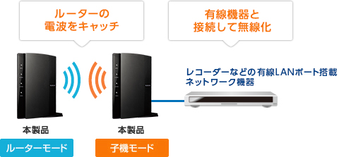 本製品を子機モードに変更することで、有線LANポートを持つネットワーク機器を無線化することができます。