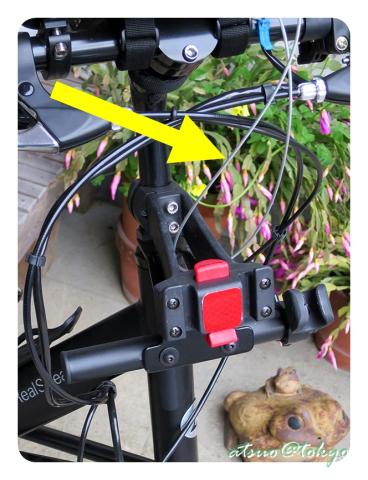 自転車購入からいろいろいじっていく中で、最初に付いていた前かご用の位置に取り付けるべくアクセサリーホルダーを自作し