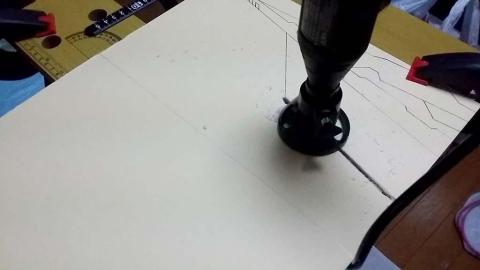 本来のデザインは、白いアクリルでパーツを細かく切り取って、黒いベースに張り付ける積りであったが、付属のカッティングビットが思いの他、太く削るタイプだったので、パーツ切り分けは、いい感じの切断ビットを探してから施工することにする。