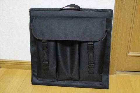 全て収納してしまえば、このようにバッグになります。大きさはそれほど小さくはありませんが、薄いので壁に立てて置けます。