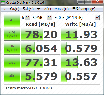 シーケンシャルリードは77MBと高速ですが、シーケンシャルライトは11MB/s前後と低速な結果に。