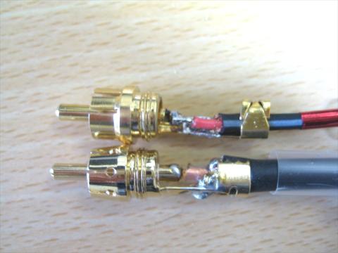 ↓上がREAN(リアン)NYS352G RCAプラグ、下が購入品 本品はケーブルのカシメ部分と信号線のハンダ付け部分の距離があまりに短いので半田付けが難しいです この辺はメーカーにノーハウ、経験がないと微妙なところです 半田乗り、流れは金メッキの所為か良いです REANは期待通り磁石に付きませんでしたよ...w