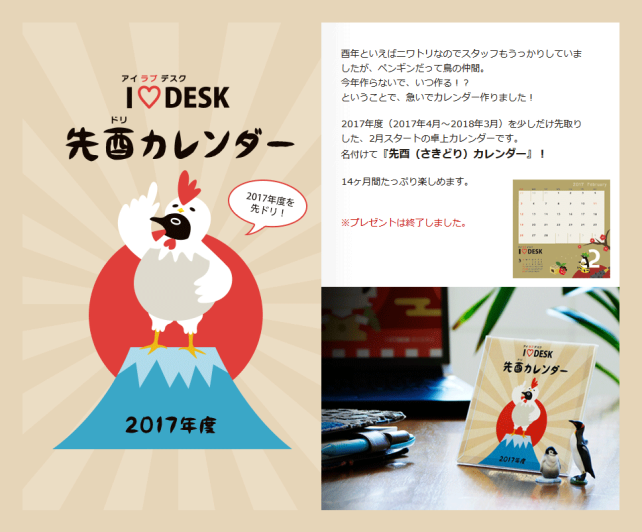 2017年度卓上カレンダー「先酉カレンダー」です。