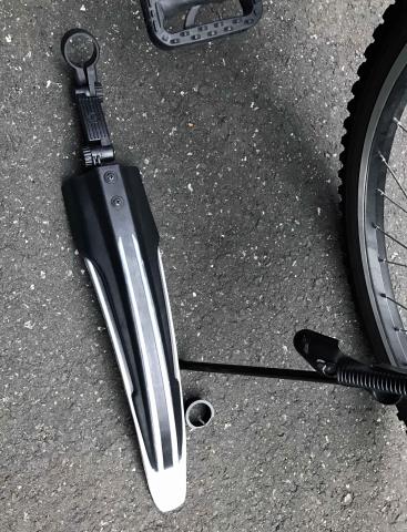 リアの泥よけを子供が折ってきました、母親はお冠でしたが、子供の理屈によると、鍵の上部にネジ止めした泥よけは場面で上下させれるものと思っていたみたいで、上下させていれば金属疲労で壊れるといった感じです